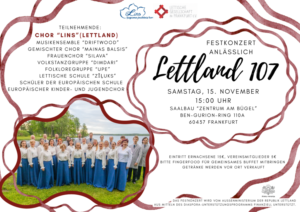 Dieses Jahr wird das Festkonzert zudem durch alle Frankfurter Ensembles bereichert: die Schule „Zīļuks“, das Volkstanzensemble „Dimdari“, der Frauenchor „Silava“, der gemischte Chor „Mainas Balsis“, das Folkloreensemble „Upe“, Schüler der Europaschule sowie der Europäische Kinder- und Jugendchor.
